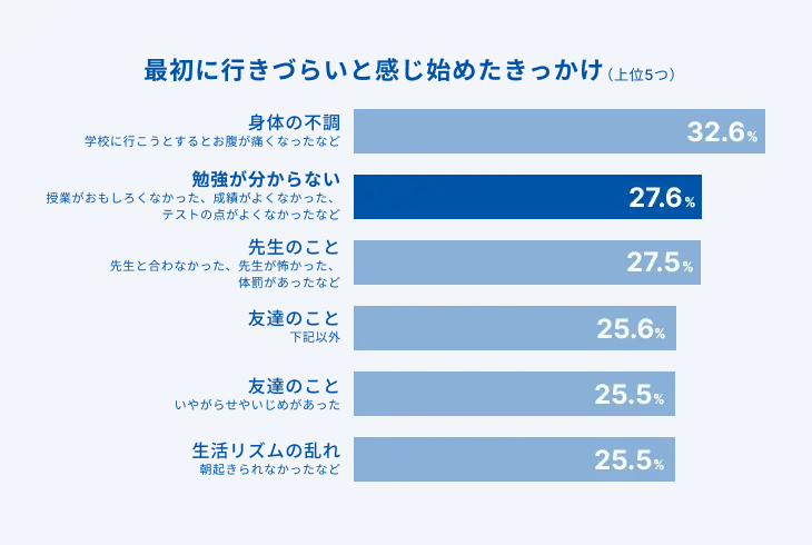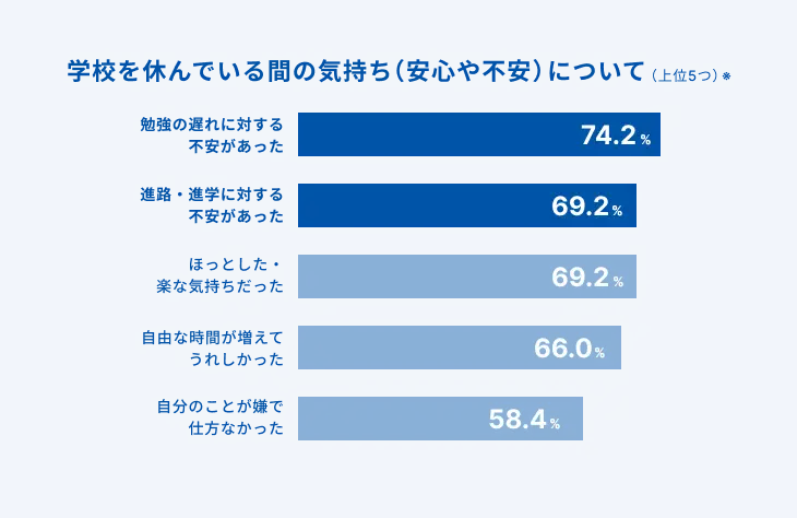 その一方で文科省の実施するアンケート調査では、不登校の最初のきっかけとして「勉強がわからない」という回答が高い割合を占めており、不登校中の子供自身が勉強の遅れや進路・進学に対する不安を感じていることがわかっています(※2)。