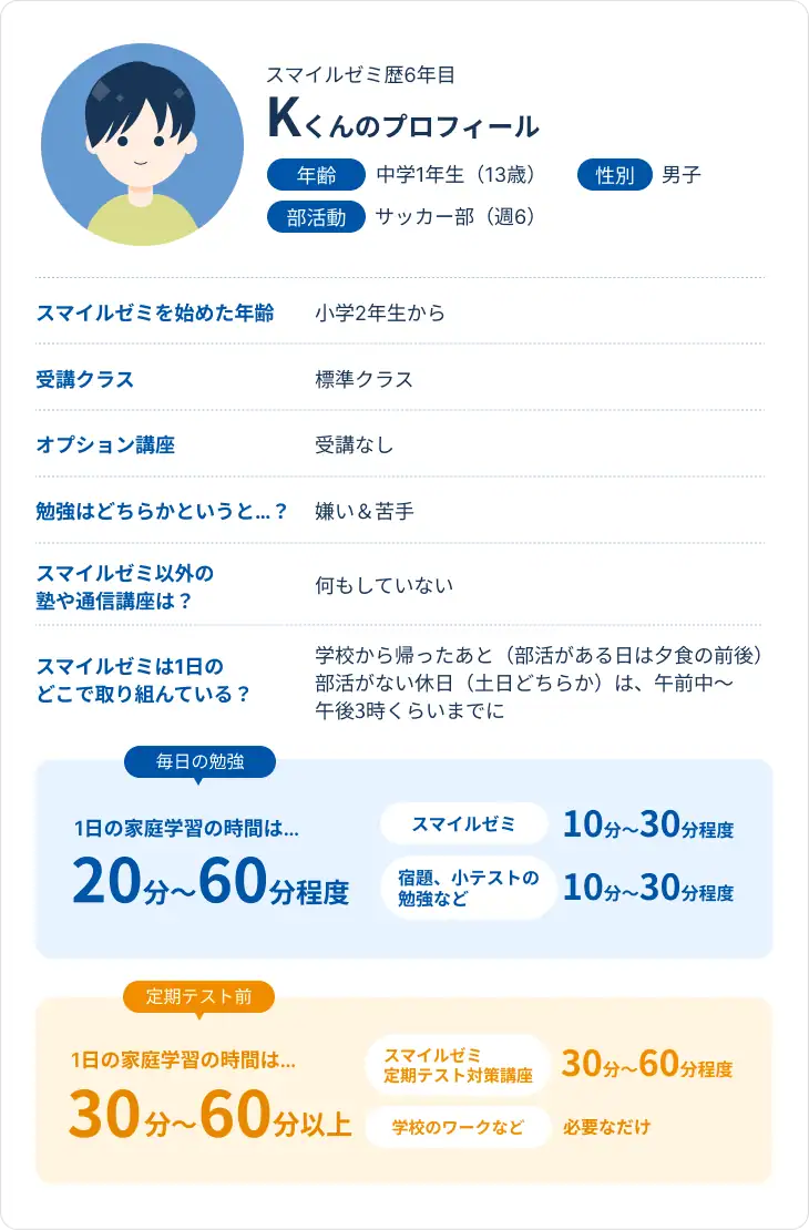 それでは今回レビューしてもらう受講生のプロフィールと共に、スマイルゼミの中学生コースの内容を見てみましょう。